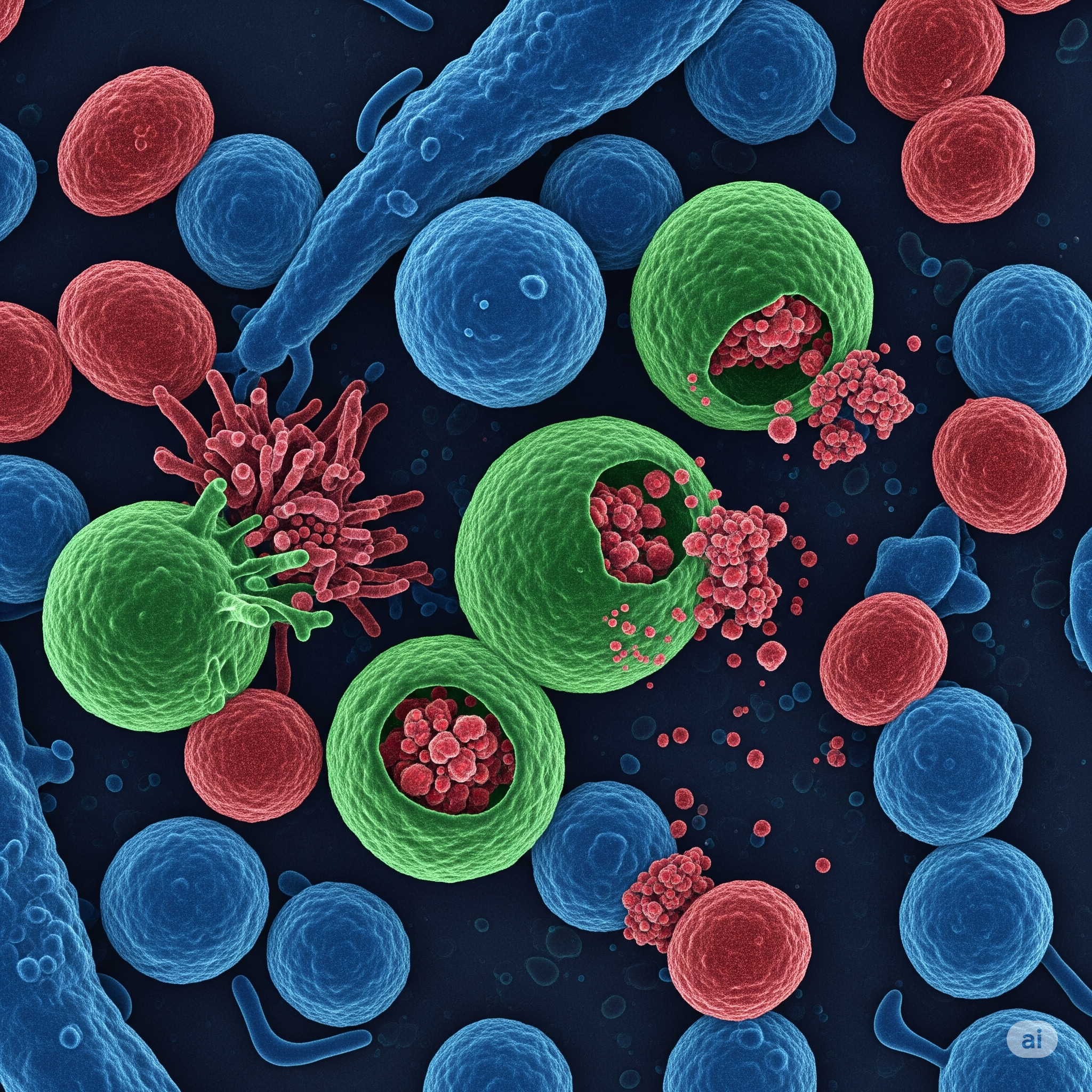 이 '명령된 자살(Apoptosis)'은 매우 중요합니다. 감염된 세포가 무질서하게 터지면 내부의 바이러스가 주변으로 퍼지기 때문입니다. 하지만 킬러 T 세포가 유도하는 자살은 바이러스 입자를 깔끔하게 세포 잔해 속에 가두어, 대식세포가 안전하게 청소할 수 있도록 돕습니다. 킬러 T 세포는 감염된 세포들을 하나씩 찾아내 제거하는 '연쇄 살인(Serial Killing)' 과정을 통해 바이러스 확산을 효과적으로 막습니다.