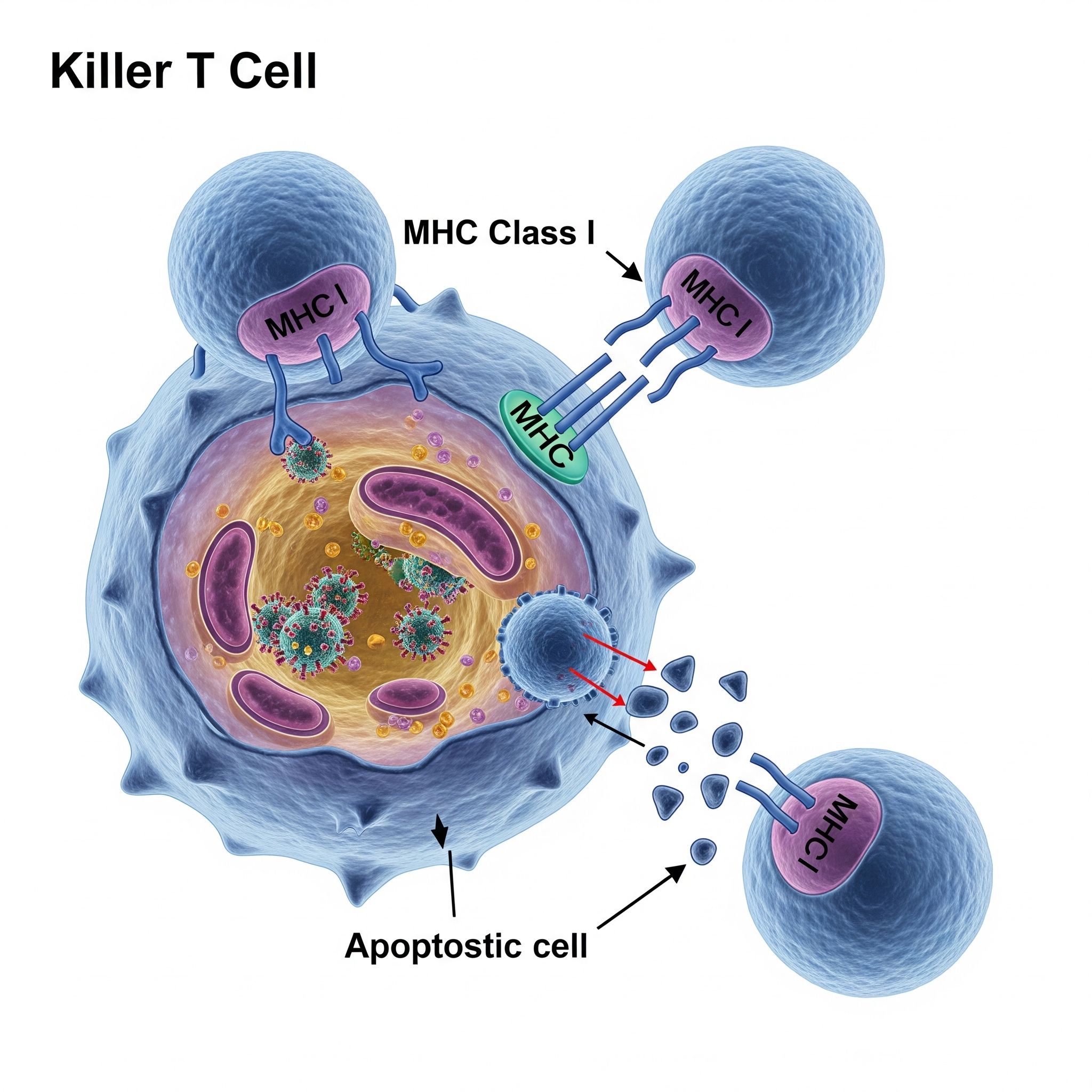 이제 감염된 세포를 직접 제거하는 맞춤형 정밀 타격 부대가 등장할 차례입니다. 바로 킬러 T 세포(Killer T Cell)입니다. 이들은 헬퍼 T 세포의 형제 격이지만, 임무는 완전히 다릅니다. 킬러 T 세포는 세포 표면의 MHC Class I '창문'에 전시된 항원을 스캔하여, 바이러스 항원이 감지되면 해당 세포에게 '깔끔하게 자살하라'고 명령합니다.